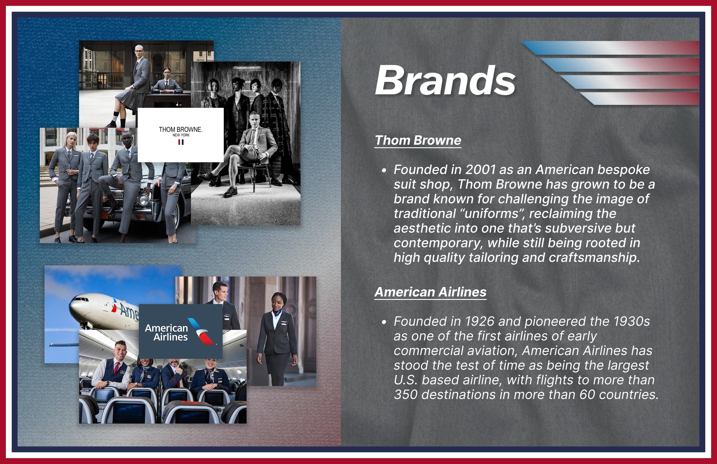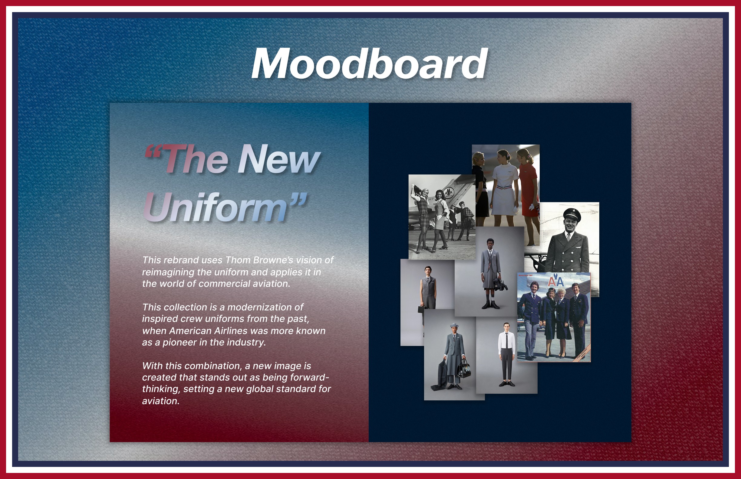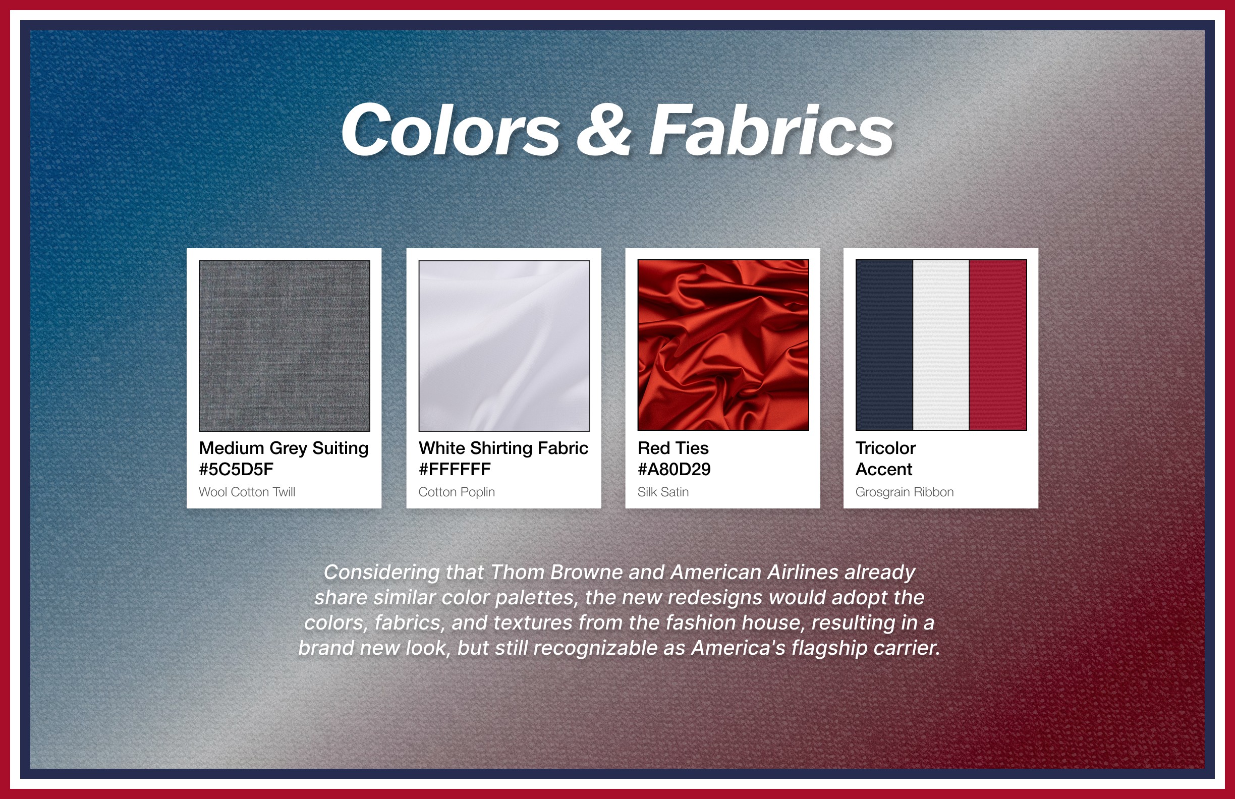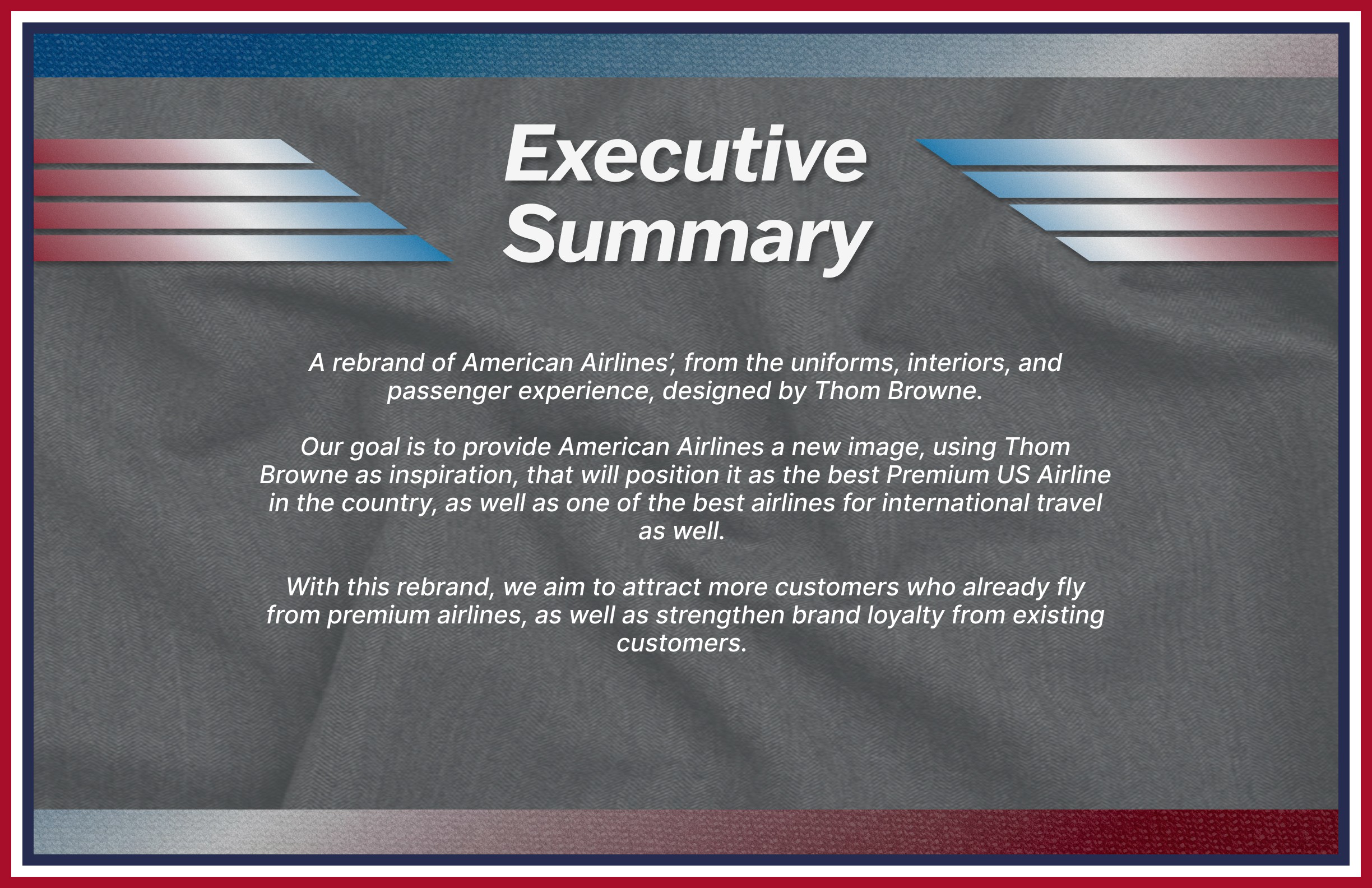 My goal was to provide American Airlines a new image, using Thom Browne as the main inspiration, that would position it as the best Premium US Airline in the country, as well as one of the best airlines for international travel as well.