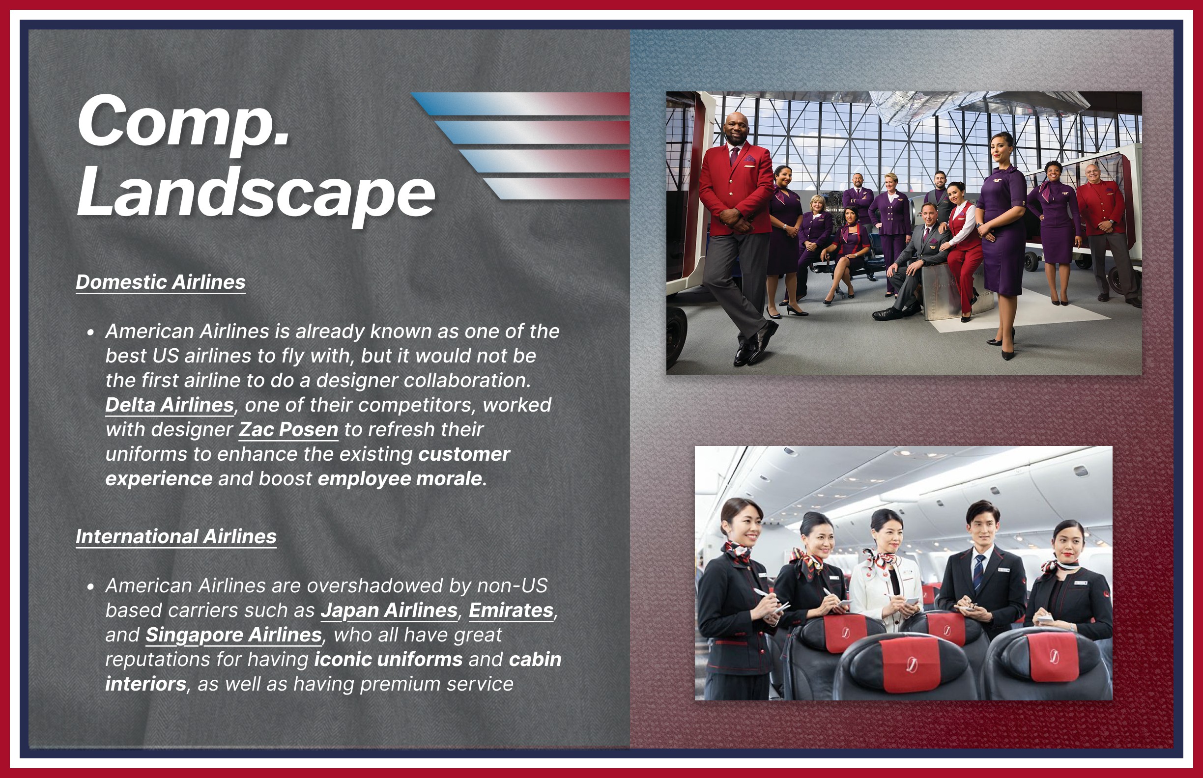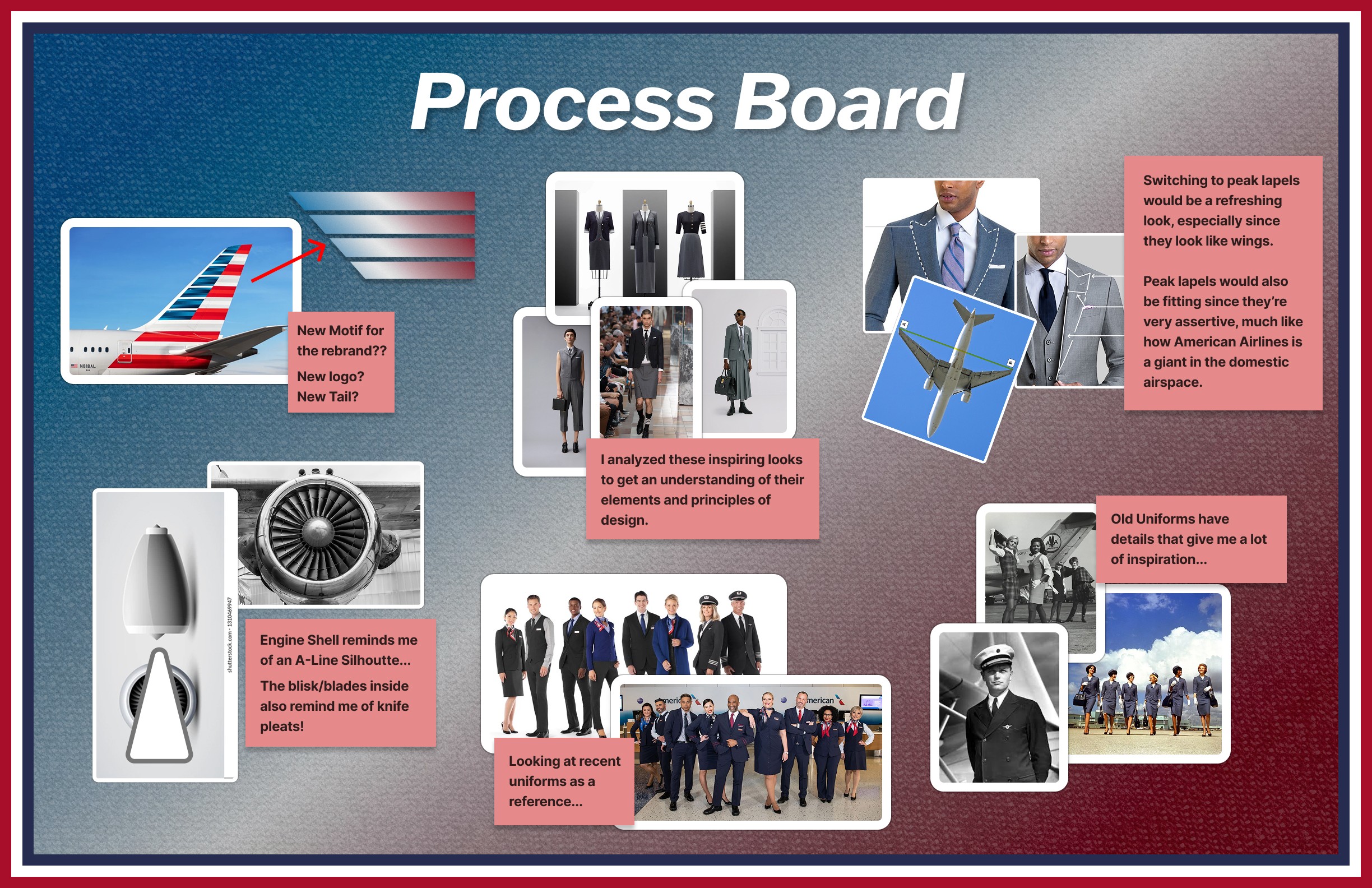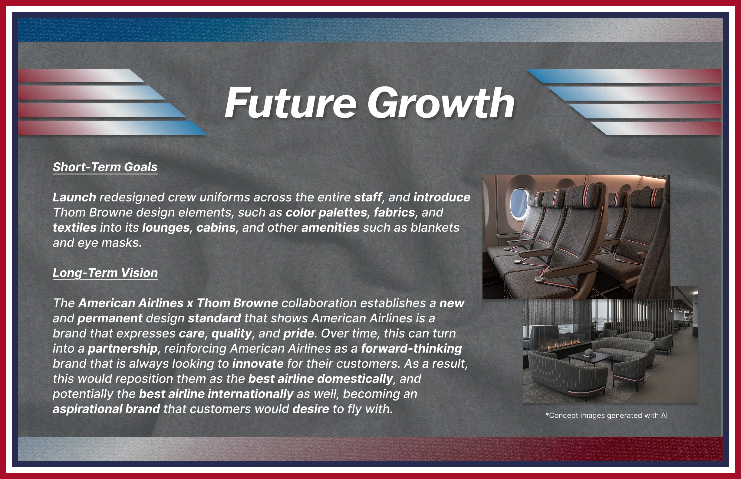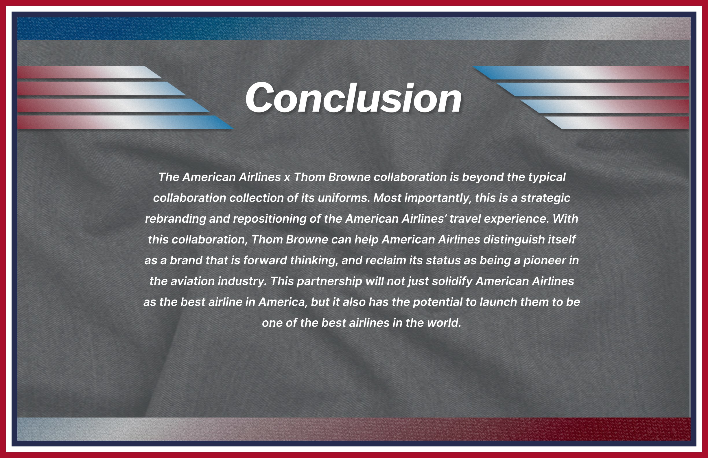 My goal was to provide American Airlines a new image, using Thom Browne as the main inspiration, that would position it as the best Premium US Airline in the country, as well as one of the best airlines for international travel as well.
